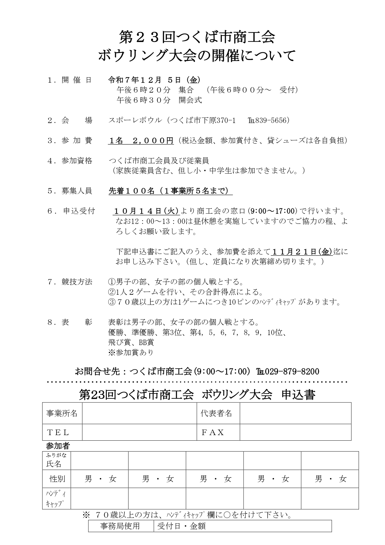 2025年11月17日 イベント 第23回つくば市商工会 ボウリング大会の開催について 会員の親睦と福利厚生を兼ねて、ボウリング大会を開催いたします。下記により参加者を募集しますのでたくさんの方のご参加をお待ちしています。 1.開 催 日 令和7年12月 5日(金) 午後6時20分 集合 (午後6時00分~ 受付) 午後6時30分 開会式 2.会 場 スポーレボウル(つくば市下原370-1 ℡839-5656) 3.参 加 費 1名 2,000円(税込金額、参加賞付き、貸シューズは各自負担) 4.参加資格 つくば市商工会員及び従業員 (家族従業員含む、但し小・中学生は参加できません。) 5.募集人員 先着100名(1事業所5名まで) 6.申込受付 10月14日(火)より商工会の窓口(9:00~17:00)で行います。 なお12:00~13:00は昼休憩を実施していますのでご協力の程、よろしくお願い致します。 下記申込書にご記入のうえ、参加費を添えて11月21日(金)迄にお申し込み下さい。(但し、定員になり次第締め切ります。) [トップに戻る]