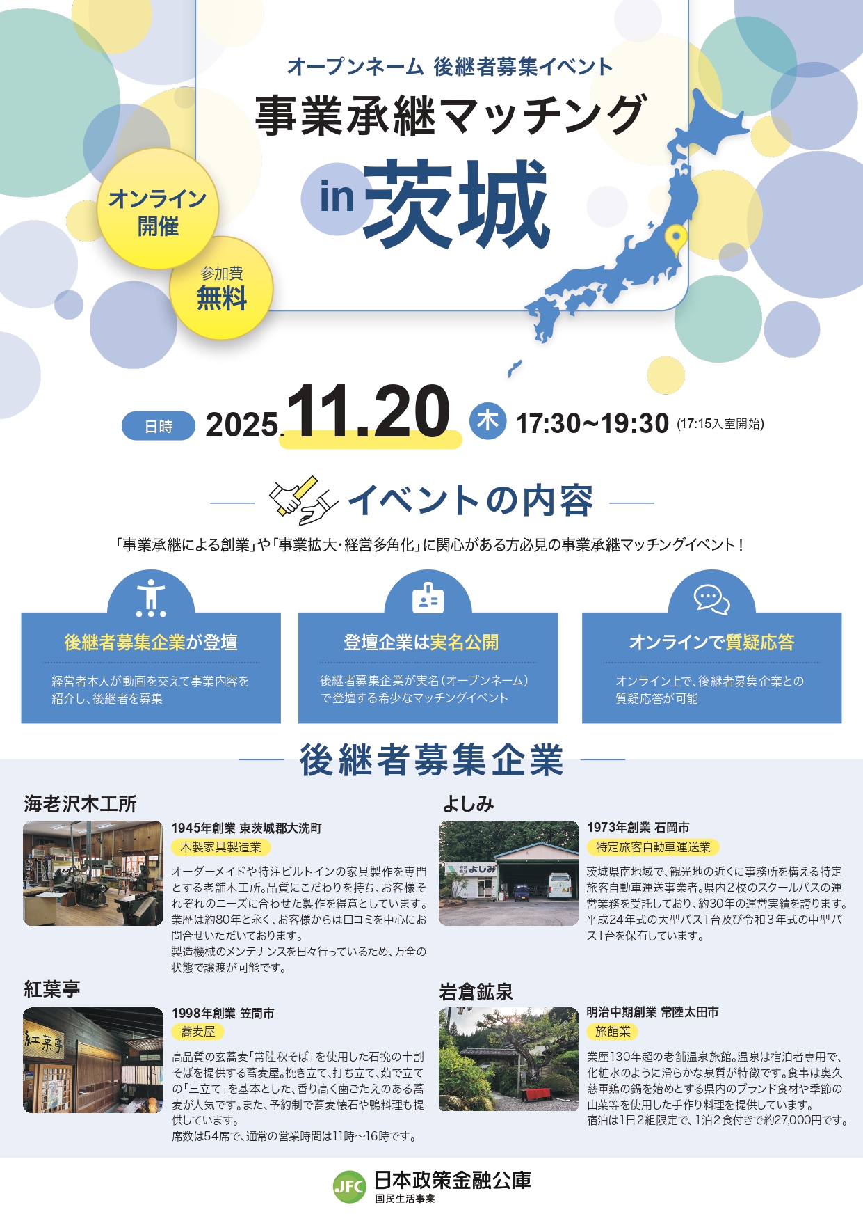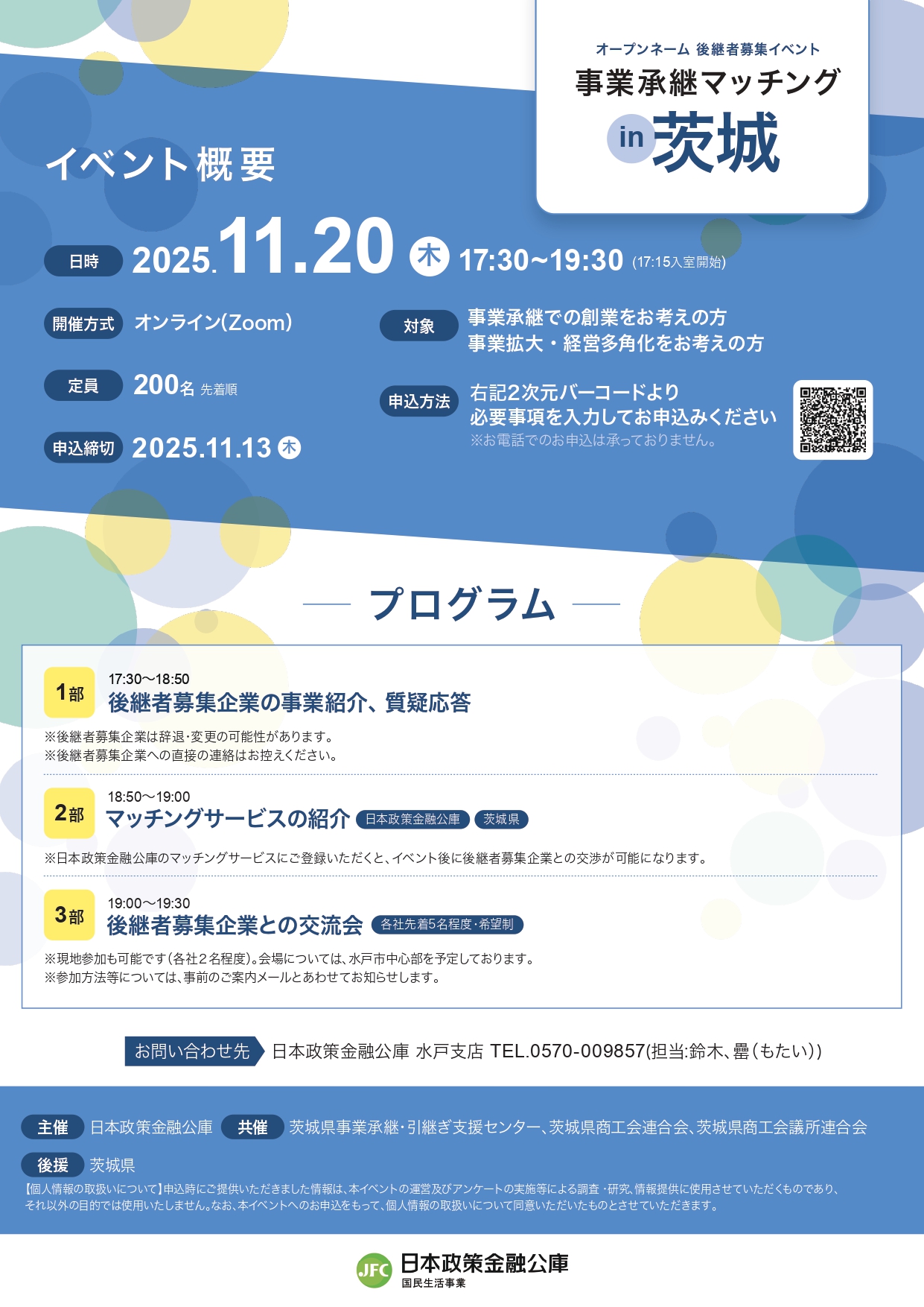 2025年10月03日(金) 事業承継マッチング in茨城(日本政策金融公庫) 【事業承継マッチング in茨城 主催:日本政策金融公庫】 「事業承継による創業」や「事業拡大・経営多角化」に関心がある方必見!事業承継マッチングイベントを開催します! 開催日時 令和7年(2025年)11月20日(木)17:30~19:30 開催場所 オンライン(Zoom) 定員 先着200名様 申込み方法及び詳細 事業承継マッチング in茨城(こちらをクリック又は下記のチラシのQRコードからお申し込みできます。) [トップに戻る]